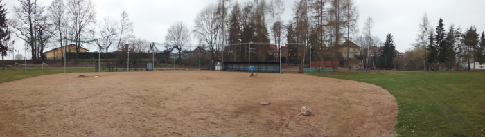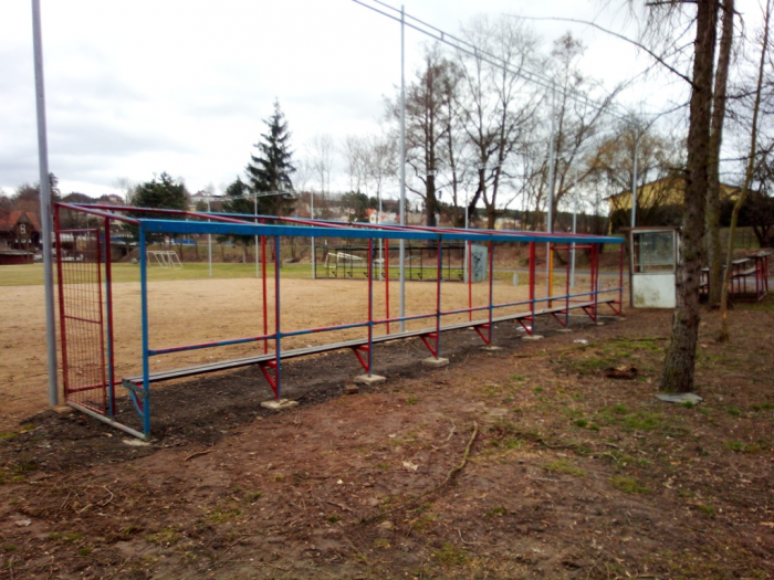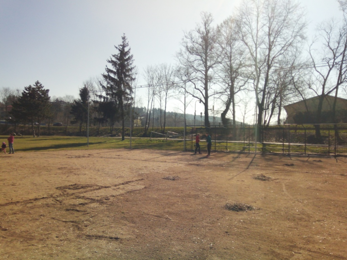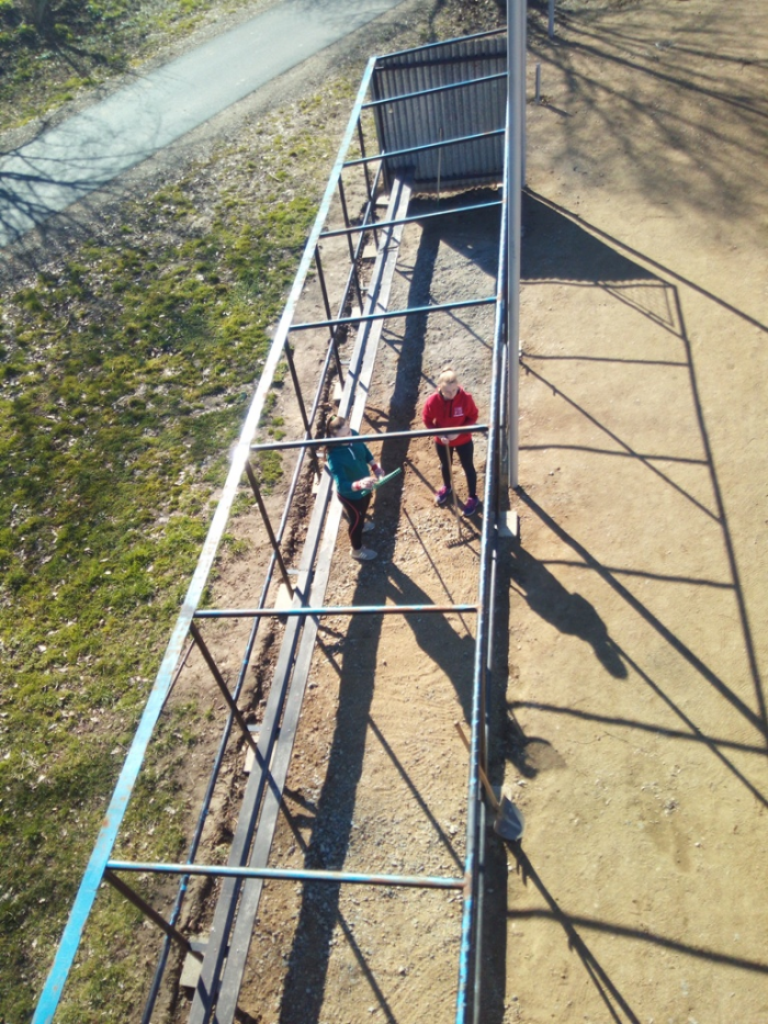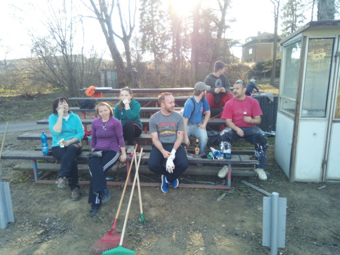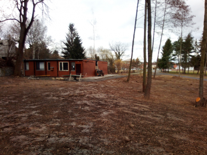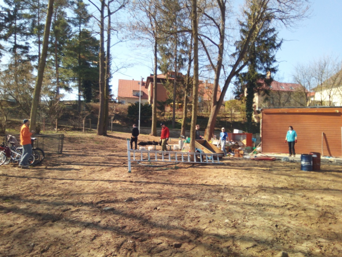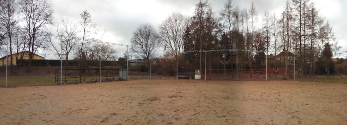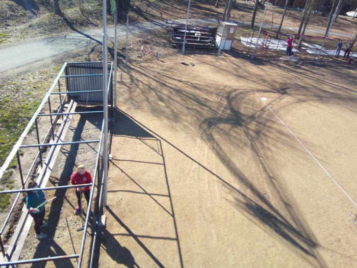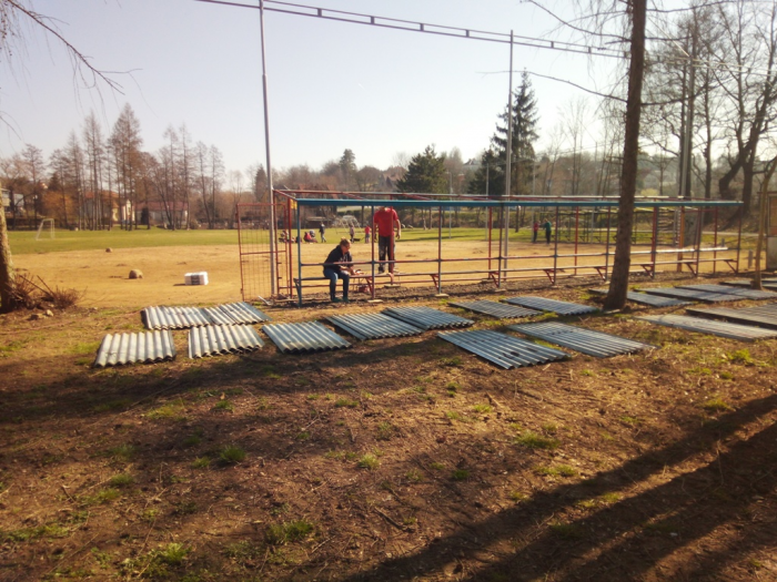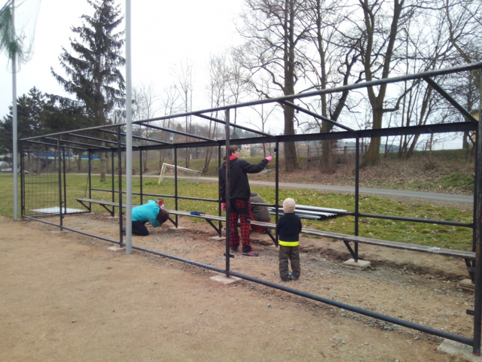 Práce na hřišti pokračují, po víkendu máme vybalenou část nábytku, použitelné dvě šatny, natřené oba dugouty, jeden opláštěný, osazené mety, vybrané kameny z plochy a sítě vytažené ke kotvení. Hodně zvládnuté práce - díky dámy, pánové, kluci a holky.