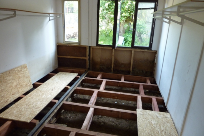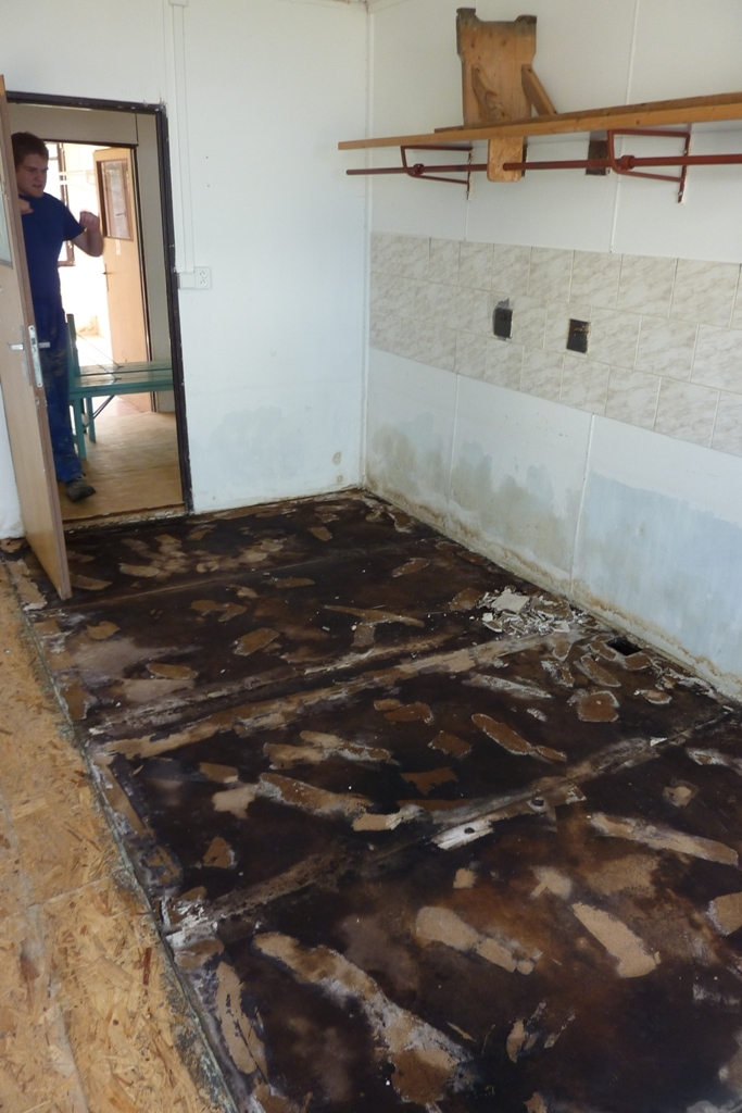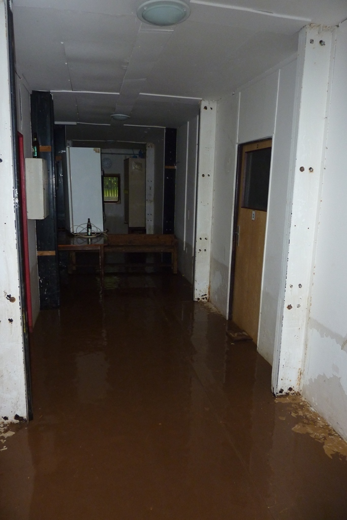 Povodně 2.6. zatopily šatny a vzhledem k materiálové skladbě objektu (dřevotřískové podlahy a obvodové stěny + sádrokartonové příčky) přinesly opravy a vysušování nemalý stavební zásah.