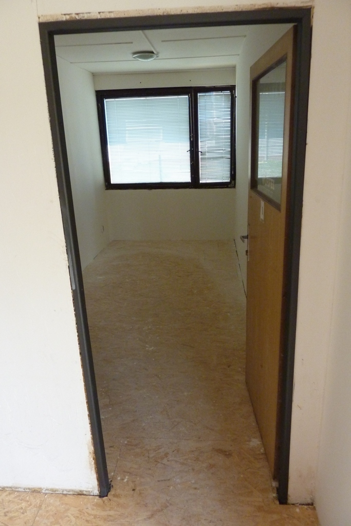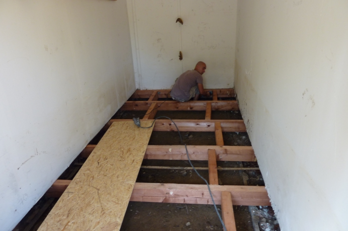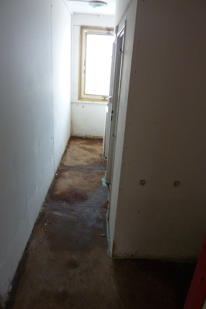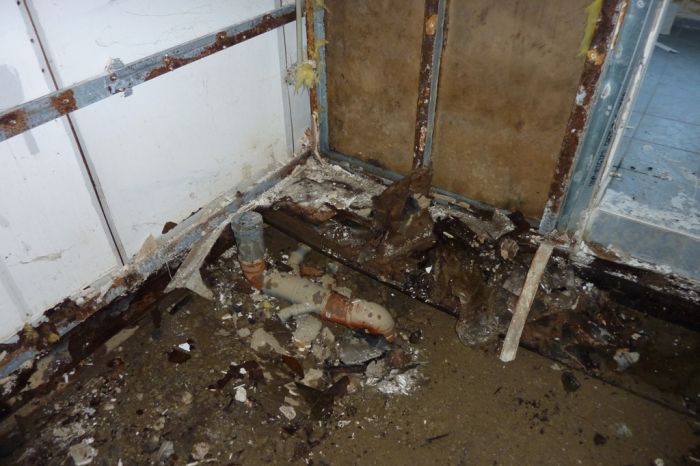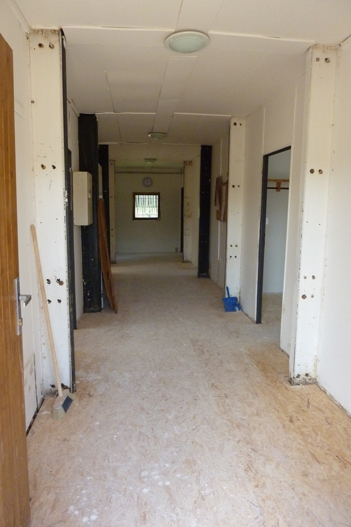 V celé budově byly demontovány kompletně podlahy (2x dřevotřísková deska, 160mm minerální vaty, hydroizolace, dřevotříska, vláknité desky a dřevotříska s izolací) a veškeré svislé konstrukce zasažené povodní (i měsíc po povodni vše nasáklé vodou). V rámci části se sociálkami bylo nutné vybourat všechny příčky a díky tomu šlo realizovat nové dispozice, především ženské WC s kuchyňkou bylo přizpůsobeno pro lepší užívání.