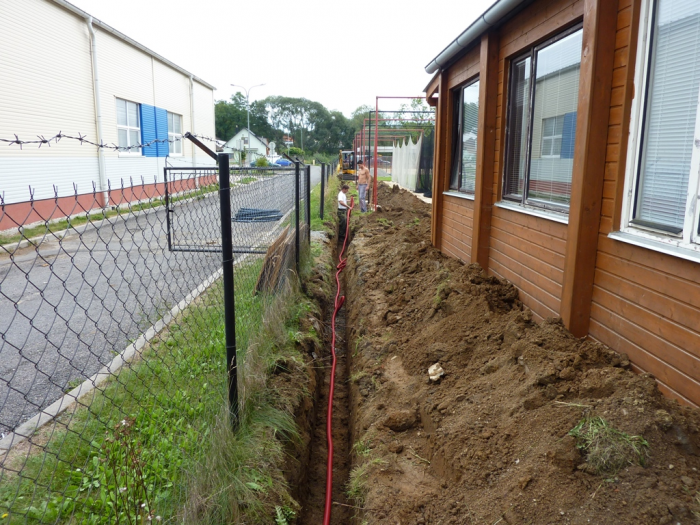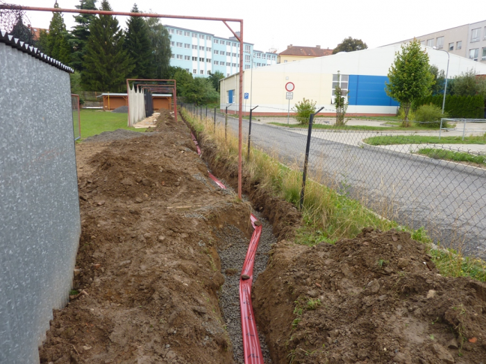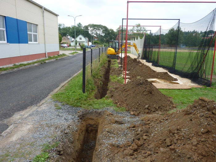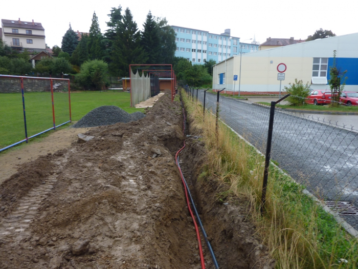 Této etapě však musely předcházet práce spojené s dovedením elektrického proudu z šaten k tribuně ve 100m dlouhém výkopu. Realizace výkopu byla s výhodou využita i k zlepšení komfortu diváků na tribuně přivedením pitné vody z šaten a osazením pítka.