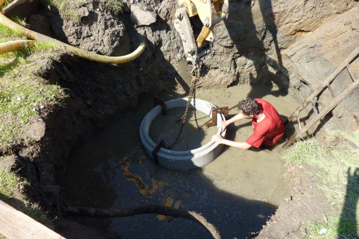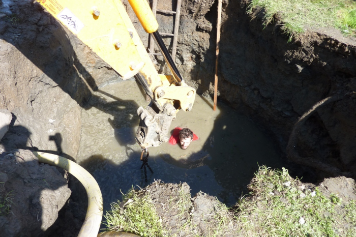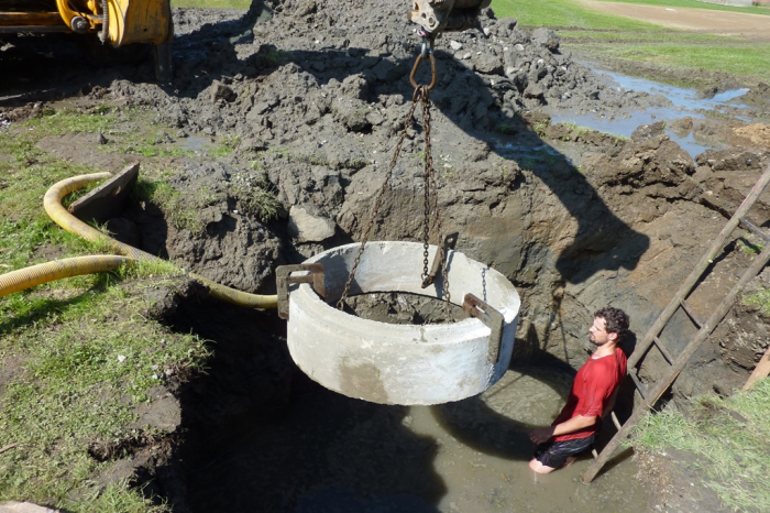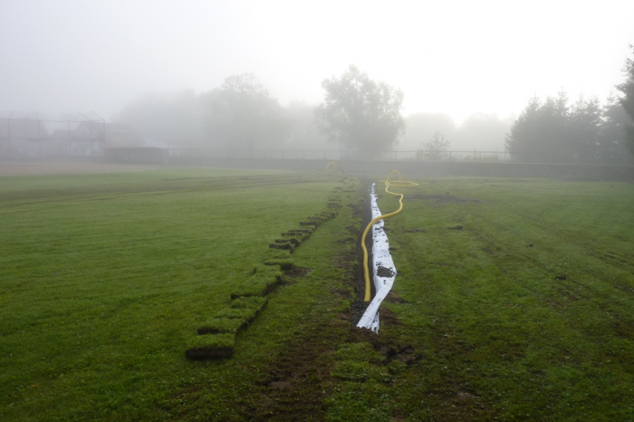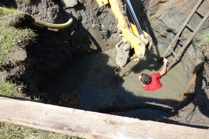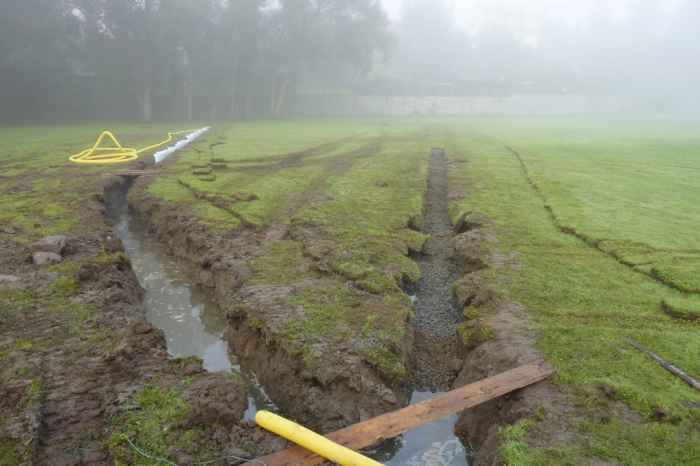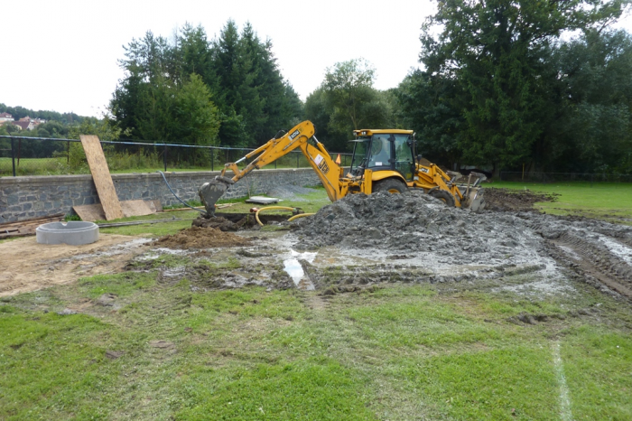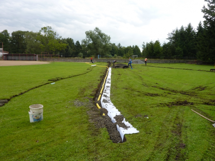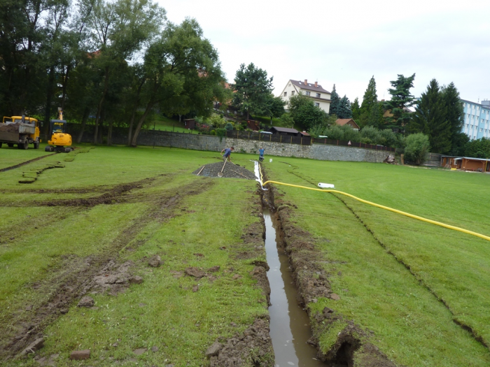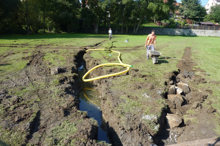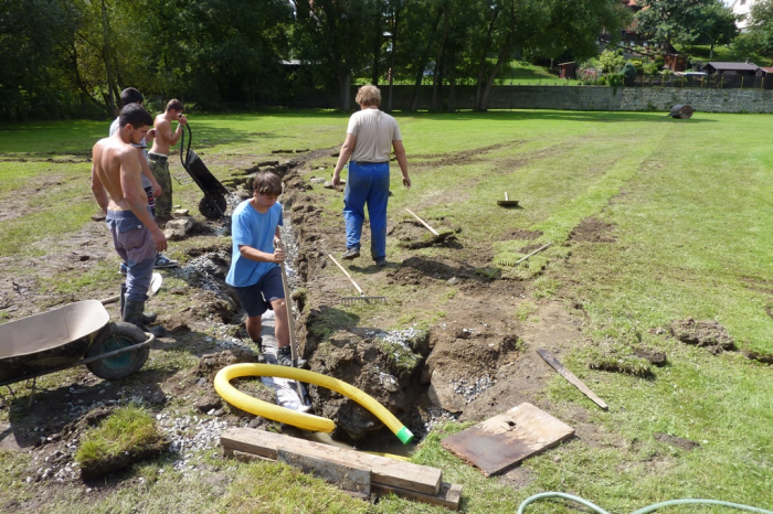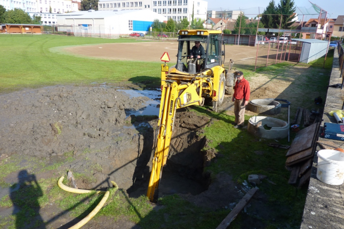 Do míst s největšími loužemi ve vnějším poli byly nataženy drenážní trubky o délce 2x50m a voda svedena do nově vykopané jímky. Jímka v sice v tuto chvíli ještě není úplně dokončena (chybí obsypat ještě část výkopu, ale už teď je funkční.