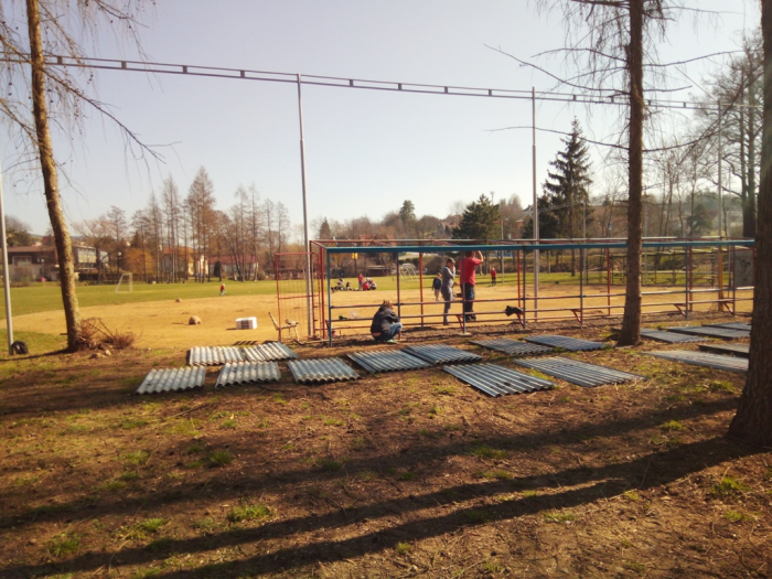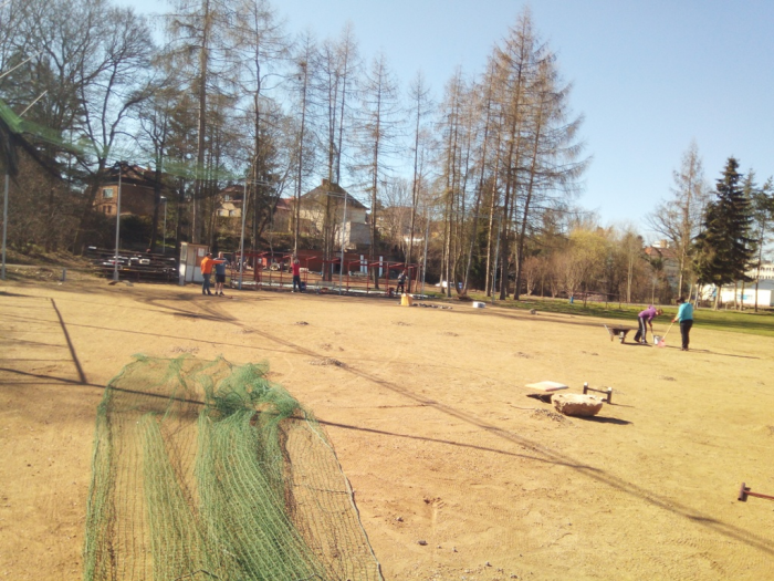 Práce na hřišti pokračují, po víkendu máme vybalenou část nábytku, použitelné dvě šatny, natřené oba dugouty, jeden opláštěný, osazené mety, vybrané kameny z plochy a sítě vytažené ke kotvení. Hodně zvládnuté práce - díky dámy, pánové, kluci a holky.